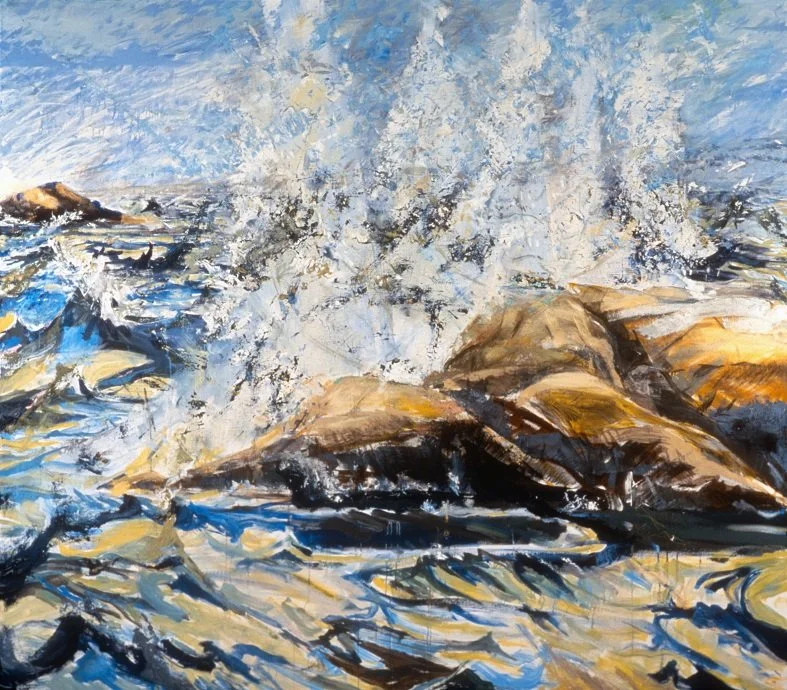 In 1994, I began a large painting, "The Breaking Wave," (76"x86") as the culmination of forty years of considering the dynamics of wave actions. That interest began in 1982 with a series of studies of a wave machine at the Scripps Institute of Oceanography . The studies were for a brochure intended for Congress in collaboration with my ex-husband, Payson Stevens, who was writing up the relevant science research to consider the dangers of offshore oil drilling in the fragile California Bight off San Diego. That was the year Reagan took office and he immediately cancelled publication, although the budget for printing was modest and already allocated. Reagan did not want Congress to see the relevant layer of scientific data before they made a decision on oil drilling.