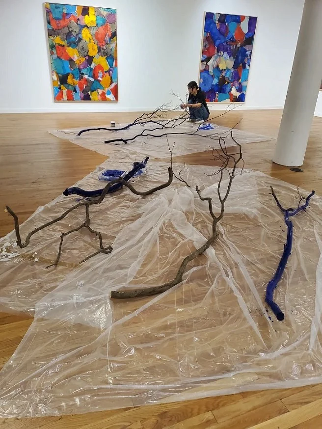 Branches being painted in the gallery, with help from Elia Emery Min, in preparation for installation for the October 30 event at the Anita Rogers Gallery, 484 Greenwich St., NYC NY