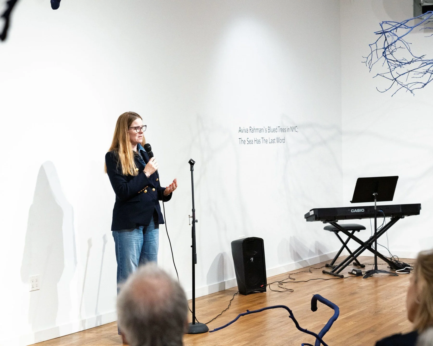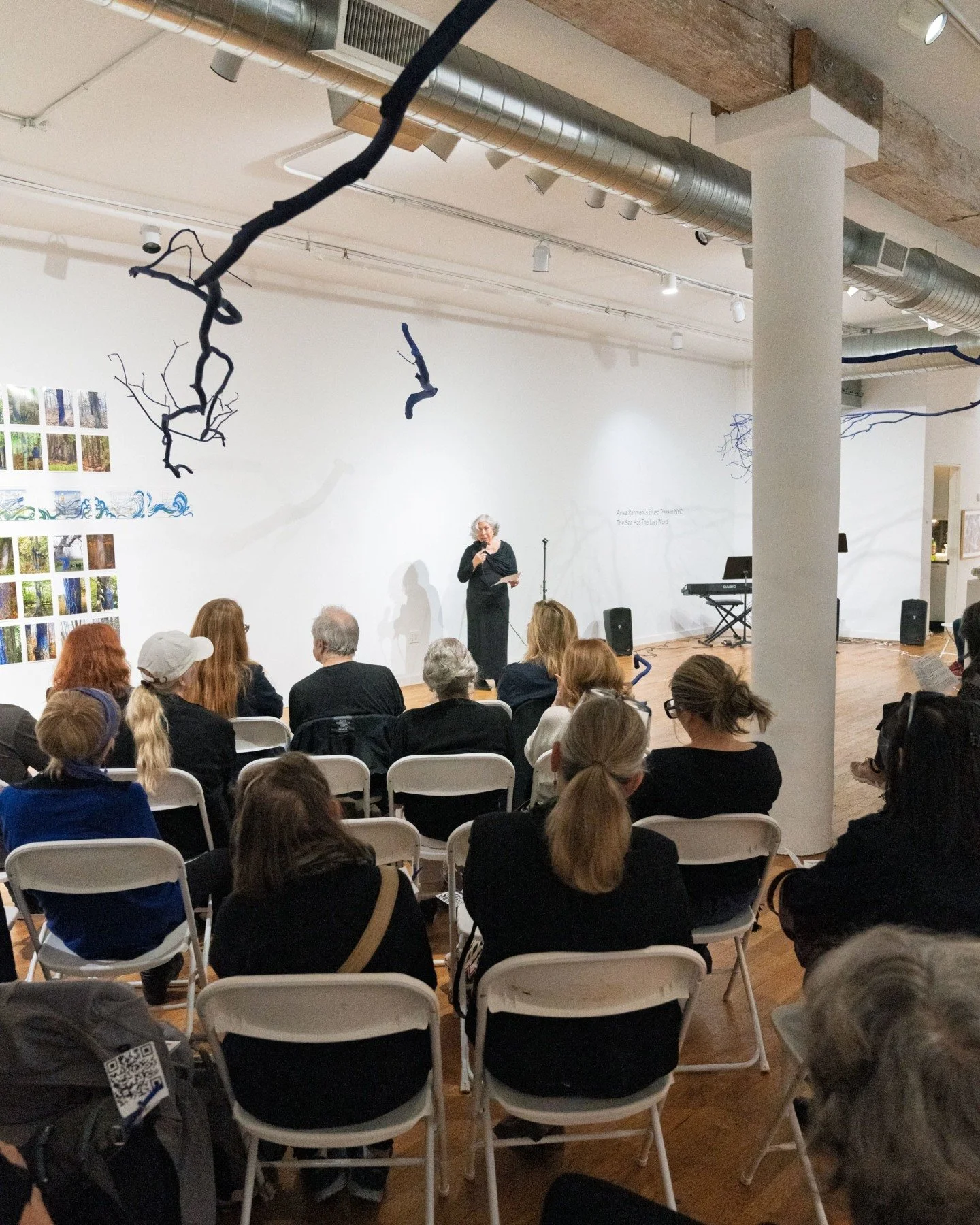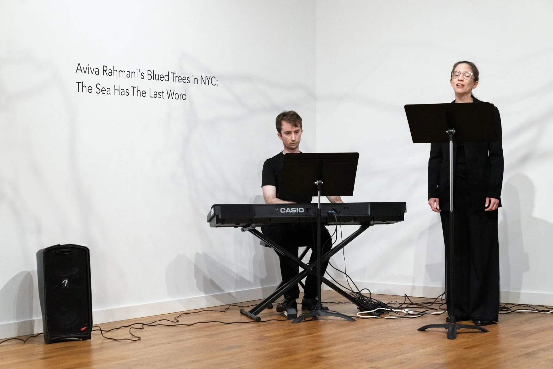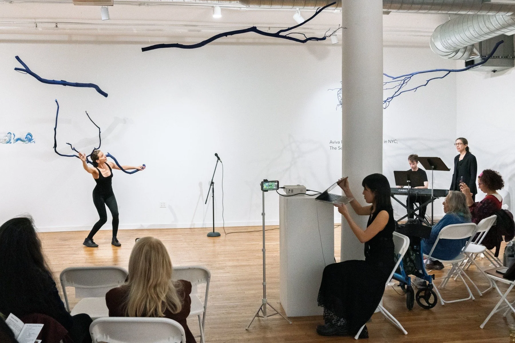 In late October, Anita Rogers Gallery hosted Aviva Rahmani's Blued Trees (2015 - present), her collection of embedded dispatches from the front lines of ecological conflict. Rahmani presented excerpts from her Blued Trees opera with dancer Rishauna Zumberg, pianist and arranger Luka Marinkovic, and soloist Alison Cheeseman. Rahmani then moderated an international participatory streaming event to judge a fossil fuel executive and his wife for ecocide– what is the extent of liability?