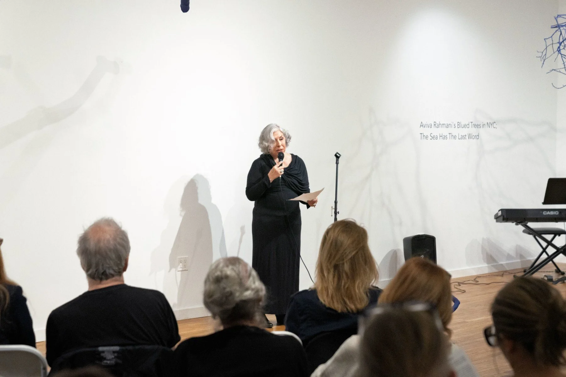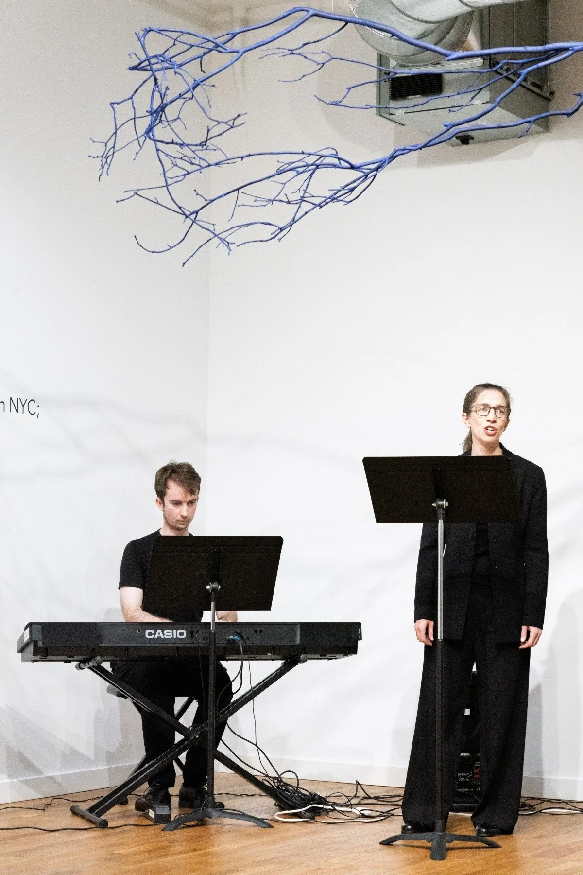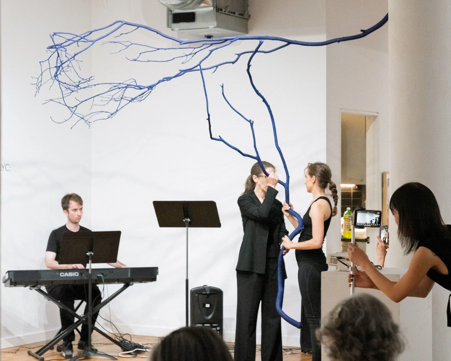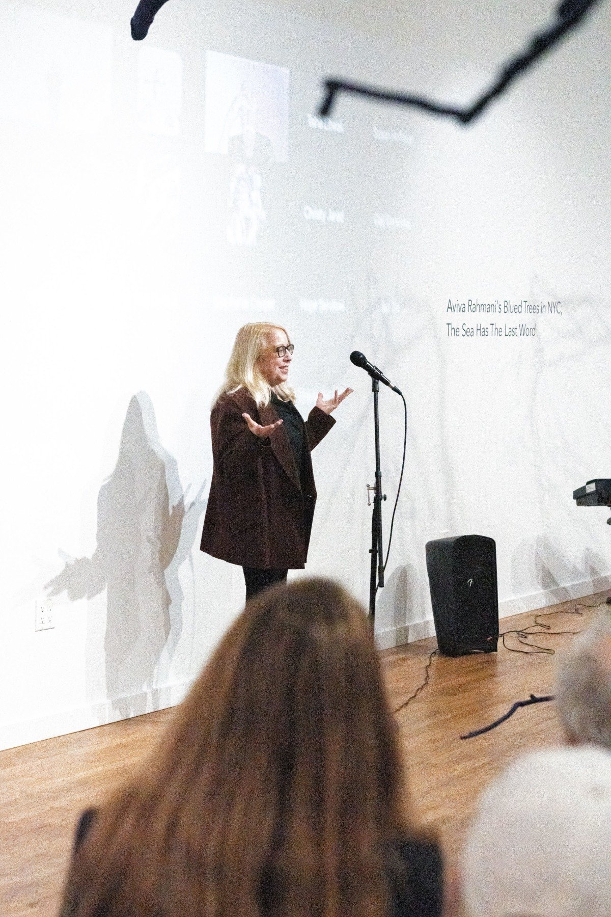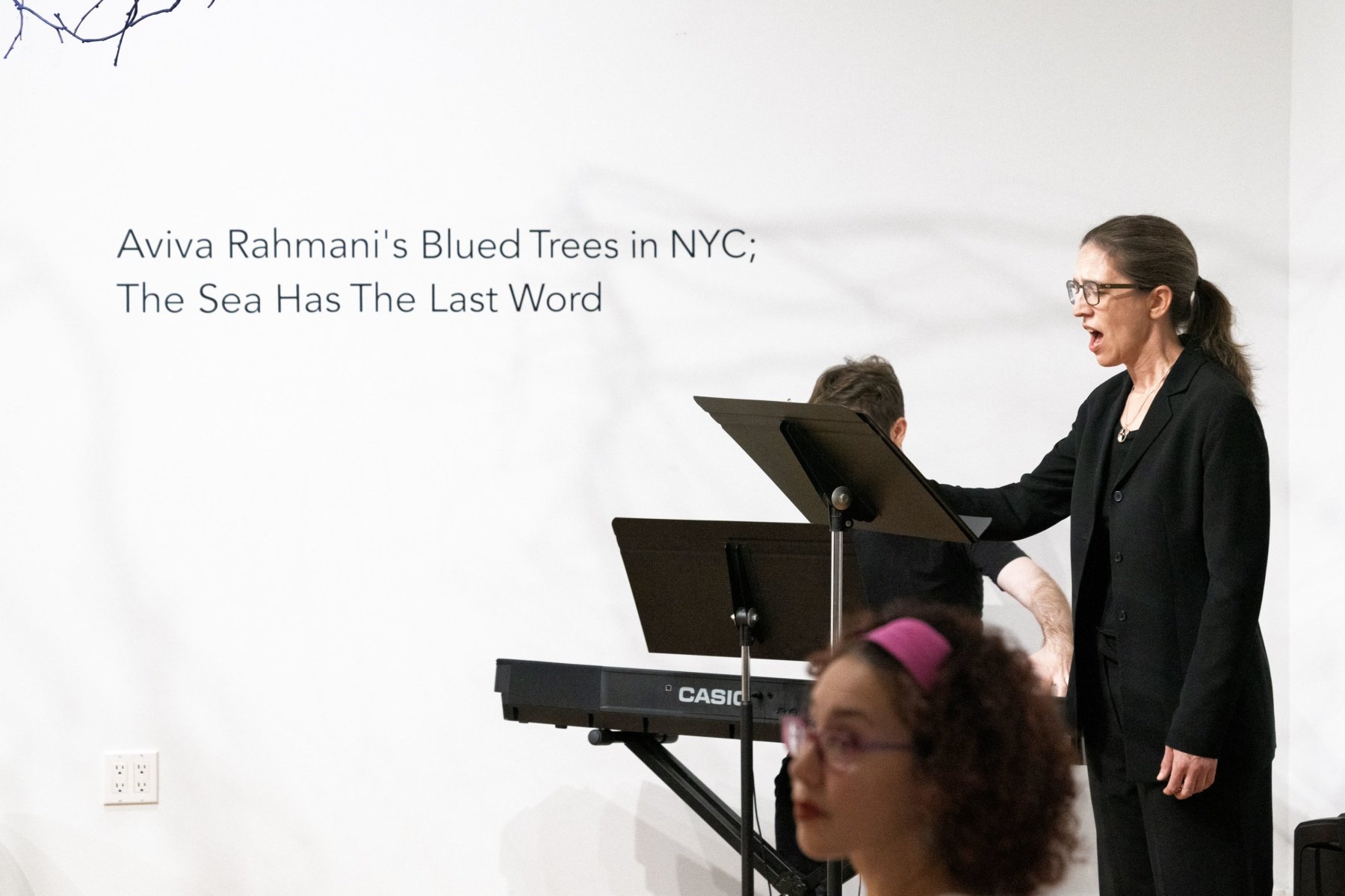 In late October, Anita Rogers Gallery hosted Aviva Rahmani's Blued Trees (2015 - present), her collection of embedded dispatches from the front lines of ecological conflict. Rahmani presented excerpts from her Blued Trees opera with dancer Rishauna Zumberg, pianist and arranger Luka Marinkovic, and soloist Alison Cheeseman. Rahmani then moderated an international participatory streaming event to judge a fossil fuel executive and his wife for ecocide– what is the extent of liability?