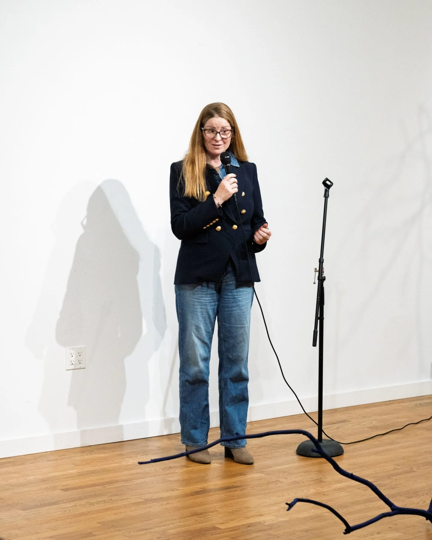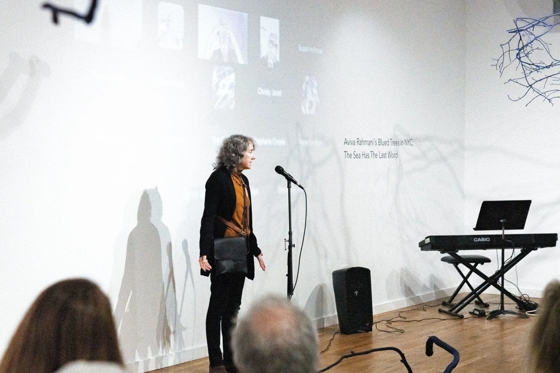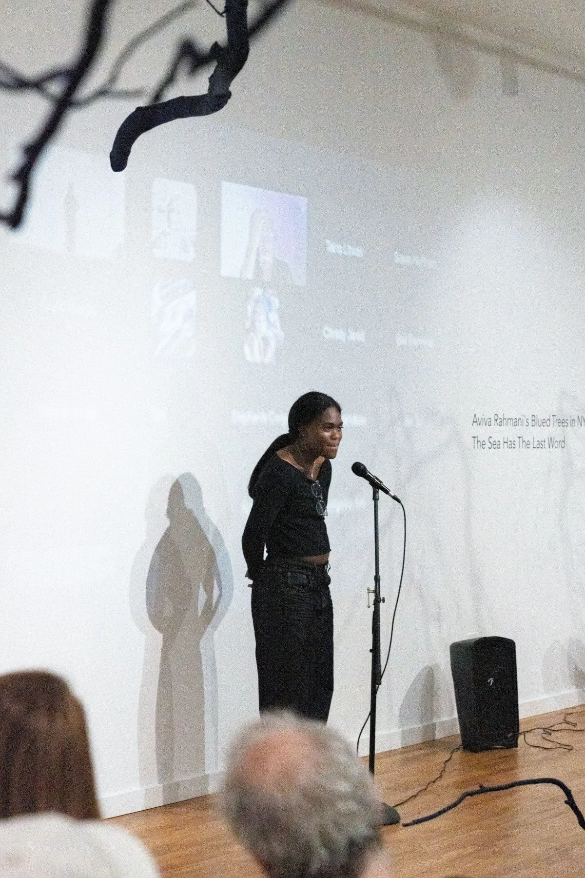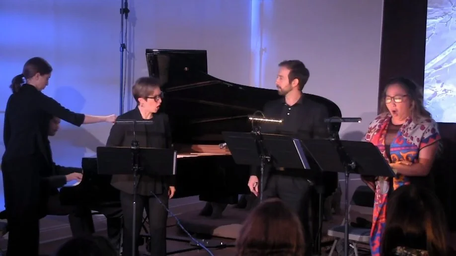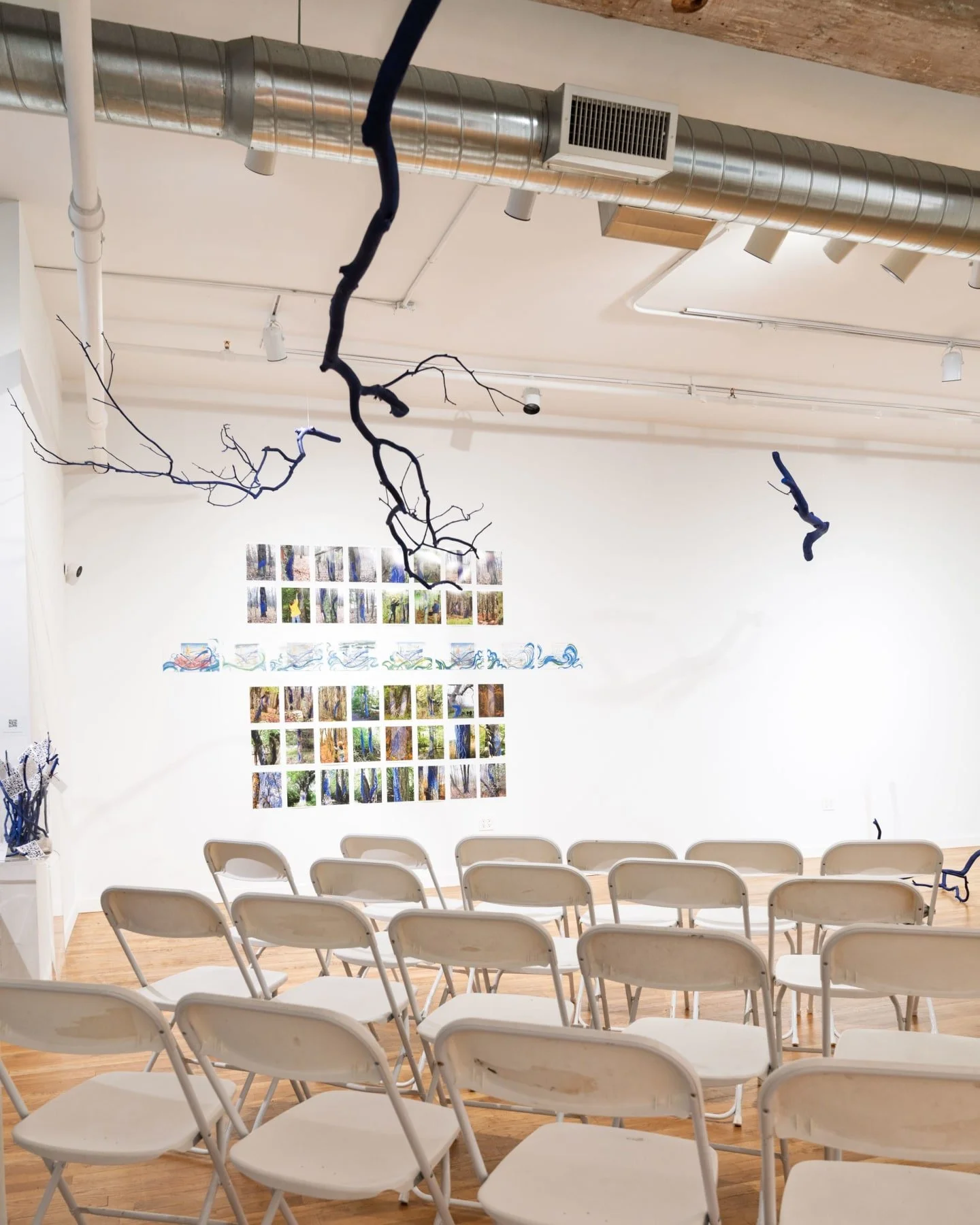 In late October, Anita Rogers Gallery hosted Aviva Rahmani's Blued Trees (2015 - present), her collection of embedded dispatches from the front lines of ecological conflict. Rahmani presented excerpts from her Blued Trees opera with dancer Rishauna Zumberg, pianist and arranger Luka Marinkovic, and soloist Alison Cheeseman. Rahmani then moderated an international participatory streaming event to judge a fossil fuel executive and his wife for ecocide– what is the extent of liability?