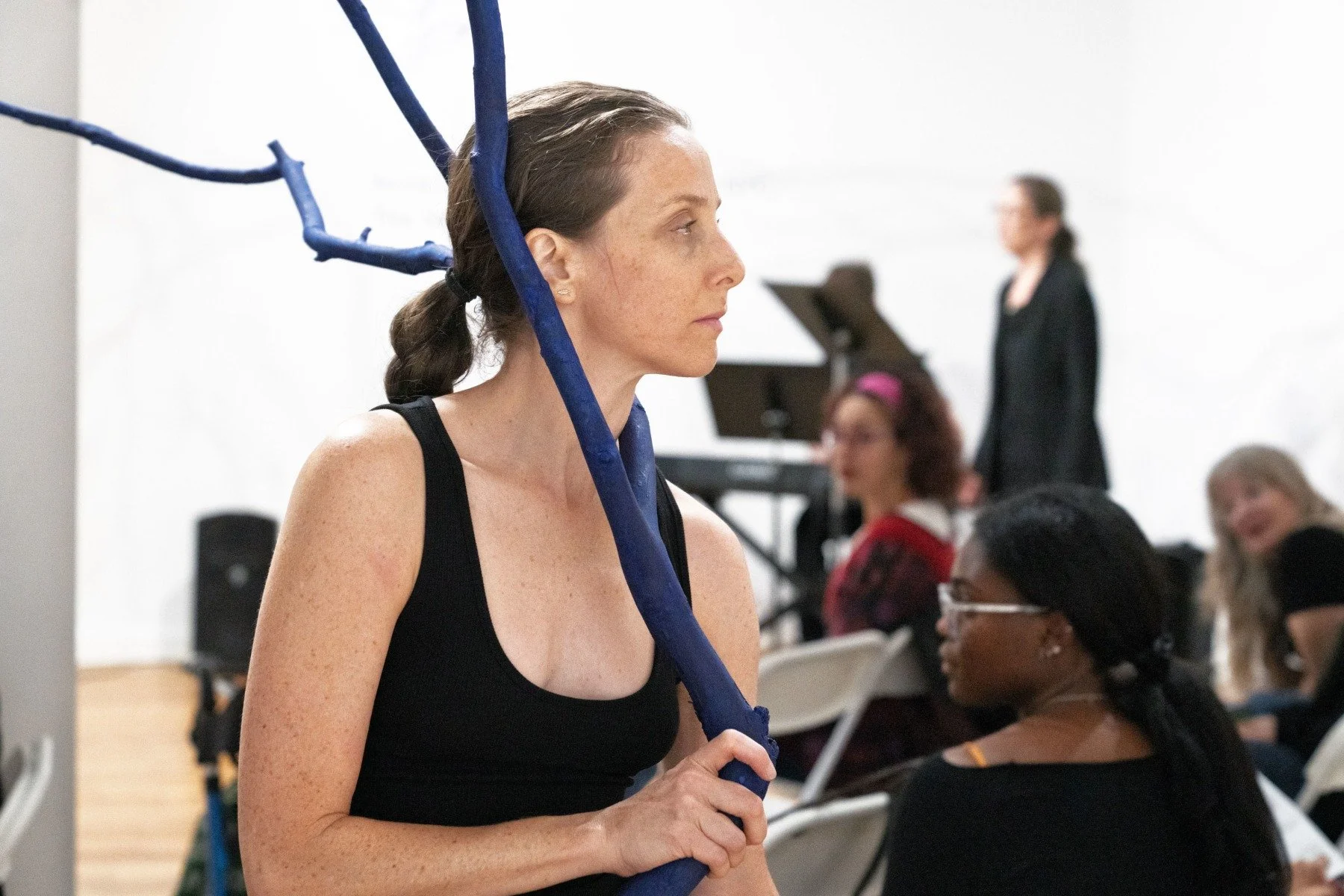 The Blued Trees, An Opera emerged as a continuation of Aviva Rahmani’s copyrighted continental scale forest symphonic composition which she initiated in 2015. She witnessed a salvo in the most dramatic story of our times: the impunity of ecocide, when a corporation massacred her tree-notes, destroying her art to install their natural gas pipelines. After a 2018 mock trial for her legal suit, she took five years to assemble the performance team and realize her narrative vision. The opera preview was created in just three feverish months and was first performed in summer 2023.