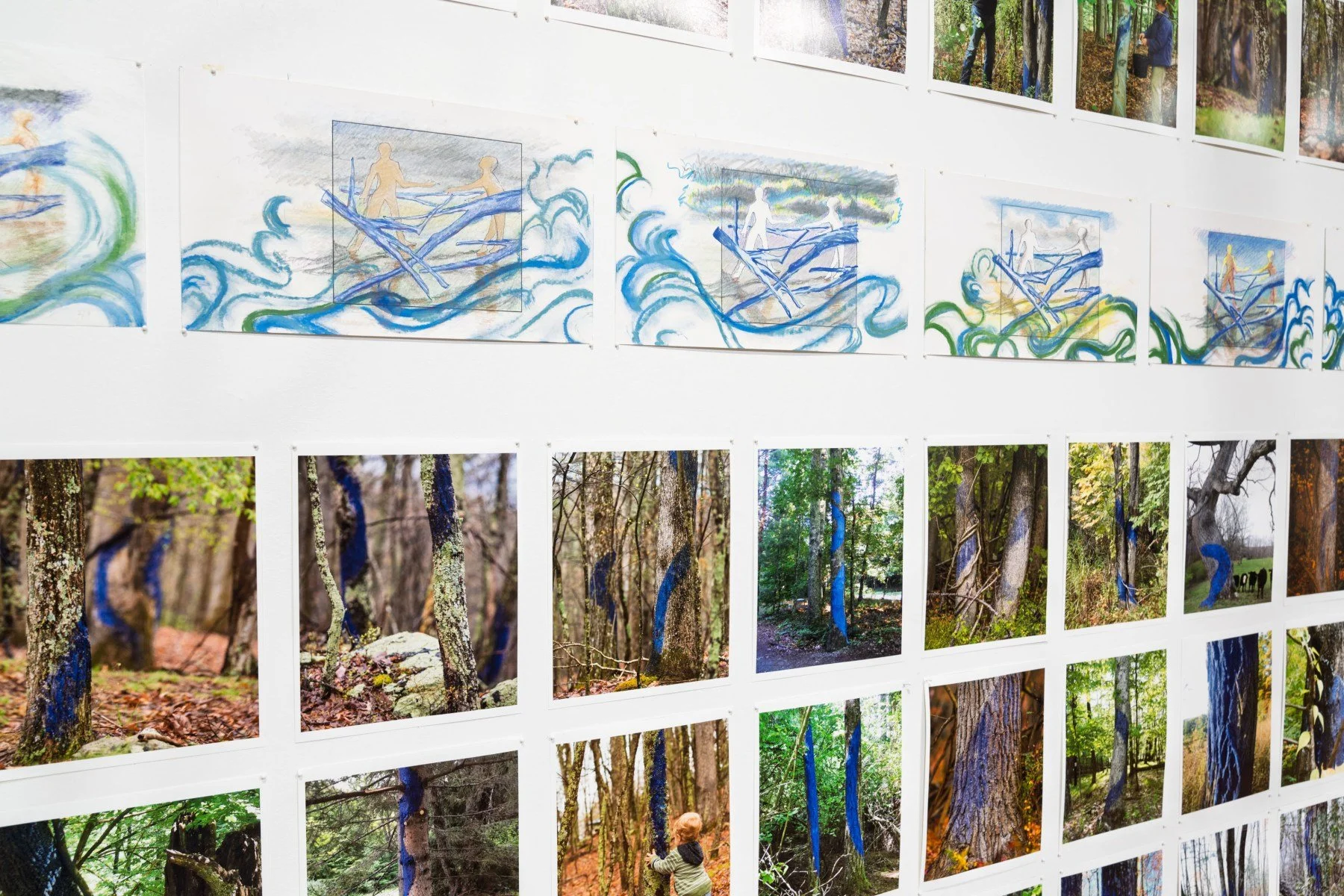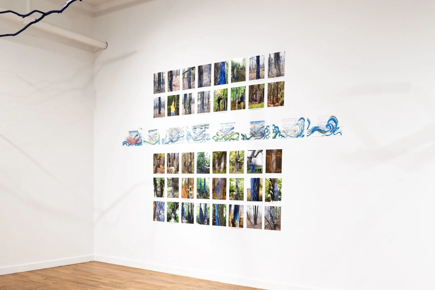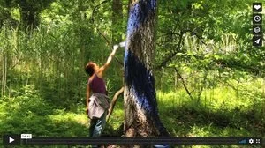 The Blued Trees Symphony launched on the Summer Solstice, June 21, 2015, with an overture in Peekskill, New York. It is now installed in many miles of proposed pipeline expansions. Each 1/3 measure of those miles have been copyrighted for protection as a single work of art. Variations of each movement are based on an iterative score created for the overture. All installations are created at the invitation of landowners. The overture was accompanied by an international Greek Chorus at a total of twenty sites internationally. Individual trees were painted and musical variations of the score were performed to echo the theme of connectivity to all life. The score is simultaneously spatial and acoustic and concluded with a coda, a final movement that recapitulated and resolved previous formal themes, on the American presidential Election Day, November 2016.
