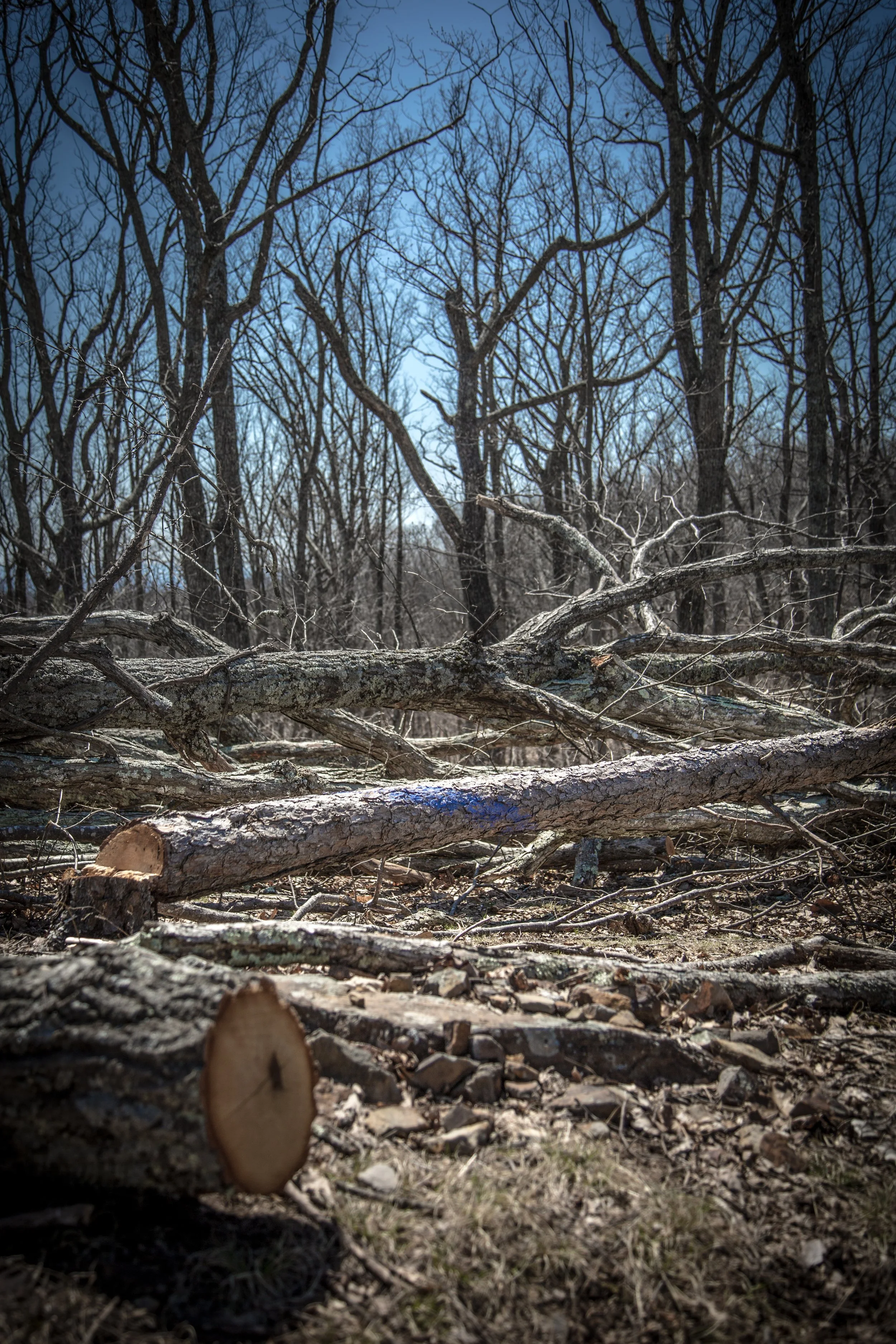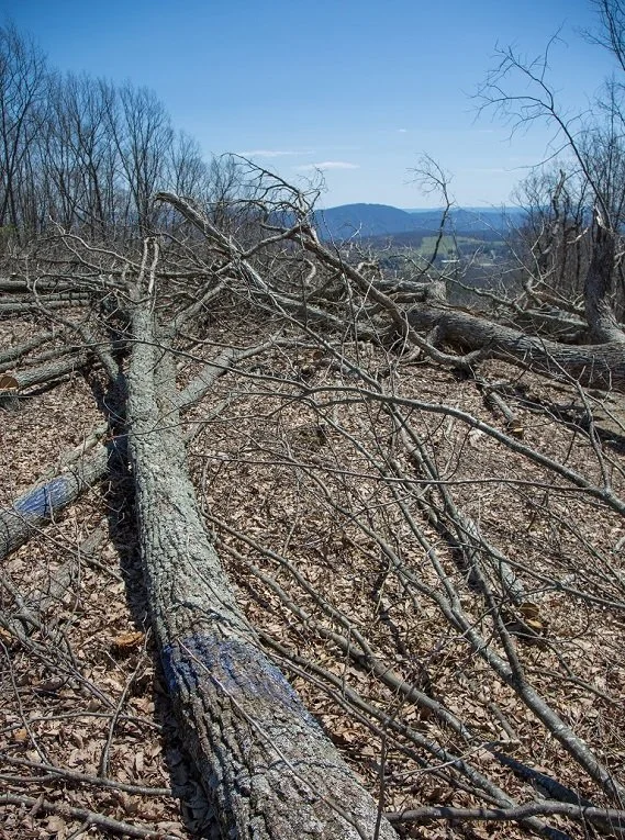 Bass Notes, Blued Trees Symphony Detail 3 Location Oneida County, New York Site 1 Date: October 2015 Size: Detail of 1/3 mile measure Materials: Trees painted with a casein slurry of buttermilk and non-toxic ultramarine blue pigment designed to grow mosses. Description: Detail of Blued Trees installation of the first symphonic movement of Blued Trees, on the second of three sites in Oneida County, New York, location of proposed Dominion New Market pipeline. Photo by Aviva Rahmani.