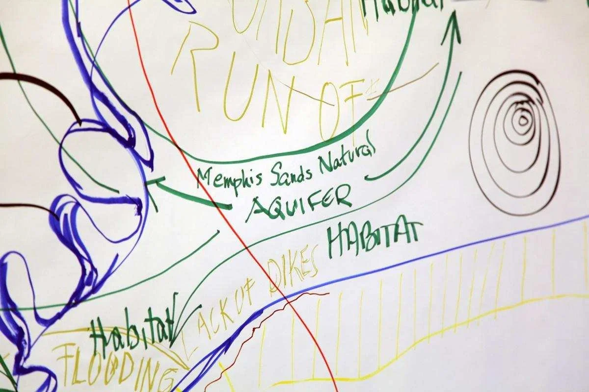 After our meditation, the group generated the map of factors to be addressed to connect the bioregional and environmental justice elements of Memphis and reveal a Trigger Point. The most striking comment was that racism is a significant impediment to progress, perhaps indicating that it might be the Trigger Point we must address to restore environmental health to the region. In response to a brief questionnaire distributed after the event, one respondent replied to the question:“Q: What did you learn?A: … insights into the inter connectedness of various forces at work.”